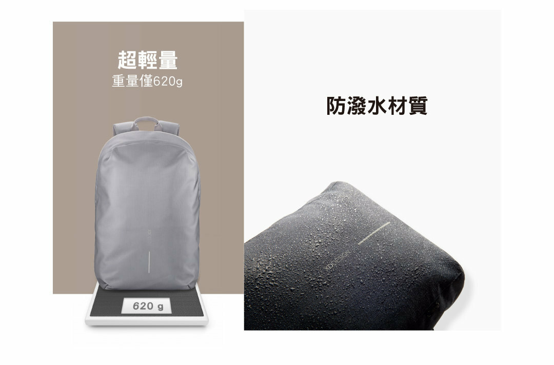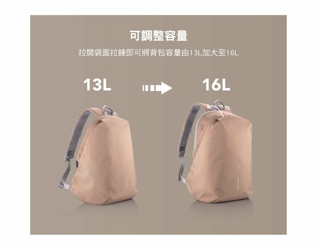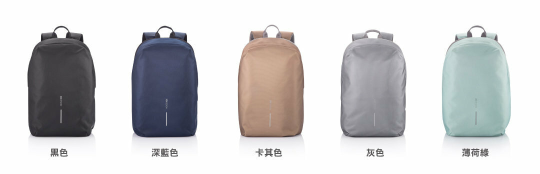 有別於以往防盜背包的堅硬設計,荷蘭 XD design 最新推出的Bobby Soft系列,採用輕巧耐用、防潑水物料製成,並有隱藏式拉鍊及配以防盜安全扣,安全性倍增;為滿足你的彈性收納需要,具有擴充容量的功能,將袋面的拉鍊拉開,輕鬆加大背包容量至16L;設有RFID 隱藏式口袋、多個實用隔層,讓你輕鬆收納電腦及個人物品,無論日常返學上班或出外輕鬆之用亦非常適合,備有5色(黑色、灰色、深藍色、湖水藍及啡色)選擇,內袋更與外袋大玩撞色配搭,盡顯活力。